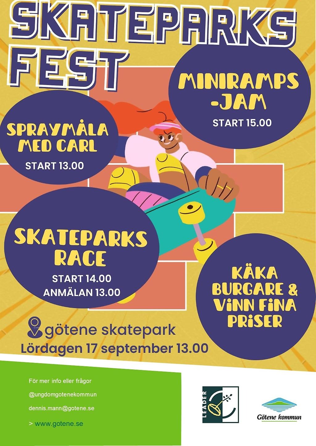 Lördag 17/9 Skateevent på skateparken klockan 13.00-17.00. Måla med Carl, åk skateboard, kickbikes. Låna gärna utrustning om ni inte har. Tävlingar, chilla och musik. Samarbete med Leader. Välkommen.