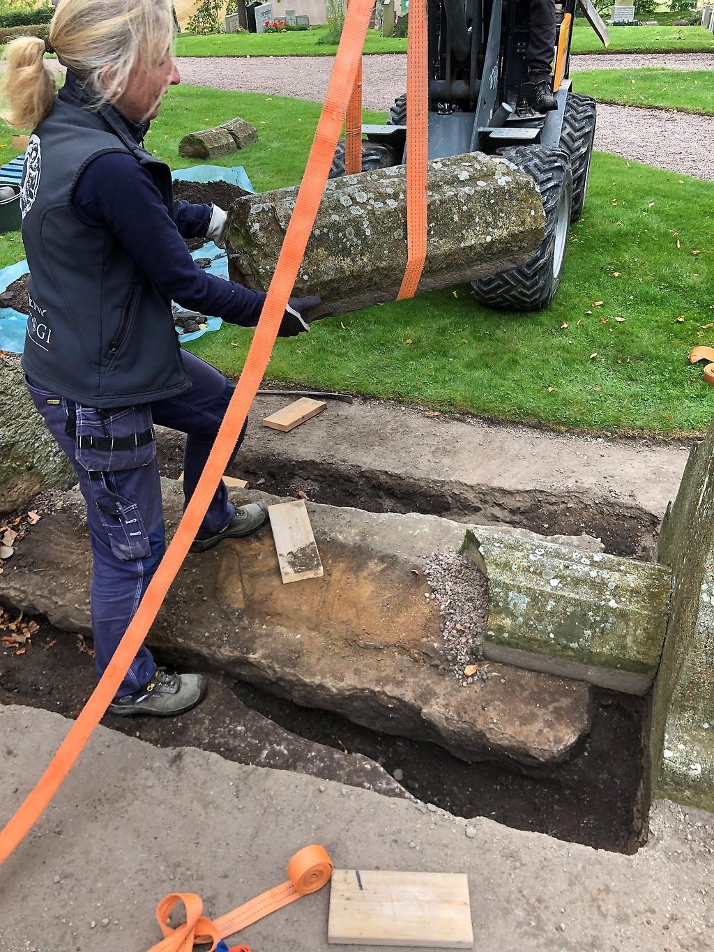Arkeologiska undersökningar av gravmonument framför kyrktornet i Husaby